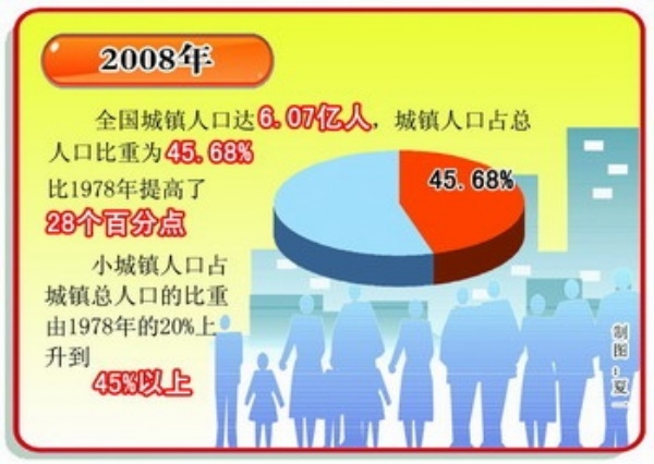 改革开放以来,我国小城镇发展呈现新局面,小城镇数量迅速增长。1978年全国仅有建制镇2173个,且以县城关镇和工矿镇为主。2008年末全国共有建制镇19234个,比1978年增加17061个。新建的建制镇大多由原乡建制发展而来,是分布广泛的乡村中心,并正在发展成为以农业服务、商贸旅游、工矿开发等多种产业为依托的、各具特色的新型小城镇。2008年全国城镇人口达6.07亿人,城镇人口占总人口比重为45.68%,比1978年提高了28个百分点。小城镇人口占城镇总人口的比重由1978年的20%上升到45%以上,2007年全国建制镇建成区面积2.8万平方公里,人口密度5459人/平方公里,小城镇聚集效应逐步显现。