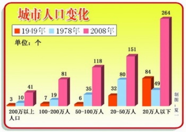 新中国成立初期,大城市寥寥无几,1949年在132个城市中100万人口以上城市仅有10个,占7.6%。新中国成立以来,城市规模不断扩大,大中城市的数量不断增多,科学的城市发展战略的实施,使得我国的城市发展结构日趋合理。2008年在655个城市中,市区总人口100万以上人口城市达122个,占18.6%;50万至100万人口城市达118个,占18%;50万以下人口城市达415个,占63.4%。