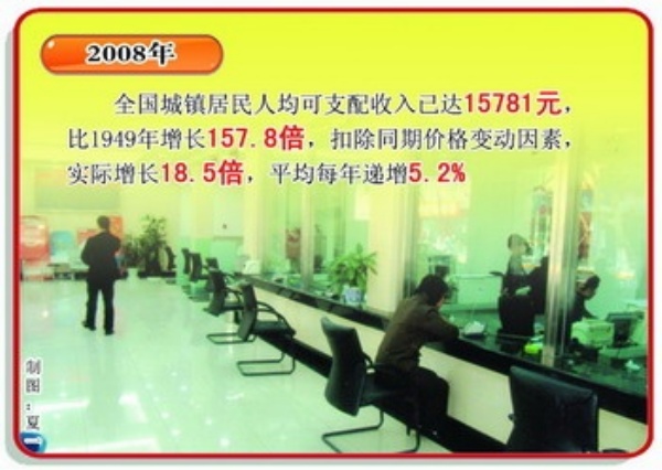 新中国成立60年来,随着经济发展,民生问题逐渐得到改善,就业岗位明显增加,工薪水平大幅增长,消费市场繁荣,城市居民生活水平明显提高,人心安定、社会稳定和谐。据6.5万户城镇住户调查资料显示,2008年全国城镇居民人均可支配收入已达15781元,比1949年增长157.8倍,扣除同期价格变动因素,实际增长18.5倍,平均每年递增5.2%。
