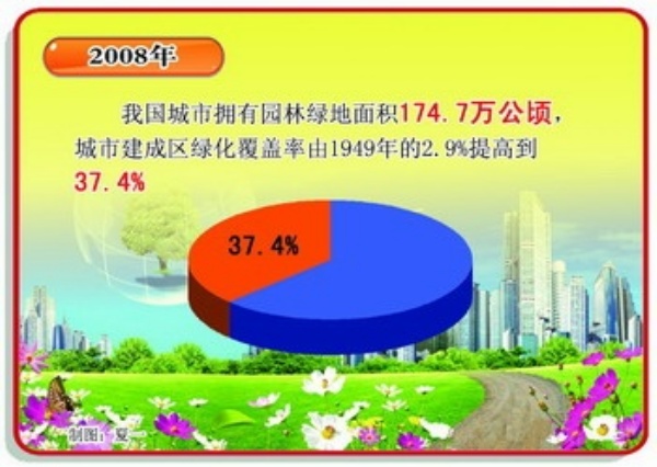 2008 年全国地级及以上城市(不包括市辖县)供水总量达429.3亿吨,其中生活用水144.4亿吨,用水人口28336万人。2008年末全国共有城市污水处理厂883座,污水日处理能力8106万立方米,城市污水年处理总量达227亿立方米,城市污水处理率70.2%;排水管道长度31.5万公里,公共厕所11.5万座,市容环卫专用车辆7.6万辆。2008年末我国城市拥有园林绿地面积174.7万公顷,城市建成区绿化覆盖率由1949年的2.9%提高到37.4%。
