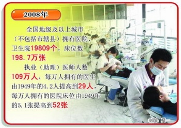 2008年全国地级及以上城市(不包括市辖县)拥有医院、卫生院19809个,床位数198.7万张;执业(助理)医师人数109万人,每万人拥有的医生由1949年的4.2人提高到29人,每万人拥有的医院床位由1949年的5.1张提高到52张,极大地解决了城镇居民就医难问题。2008年全国地级以上城市(不包括市辖县)拥有高等学校1806所,在校学生1844万人,每万人拥有的大学在校学生数由1949年的16人提高到2008年的489人。