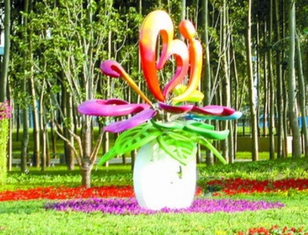 上图 室外展区以“绚丽的花博之冠”为设计主题的牡丹造型雕塑。