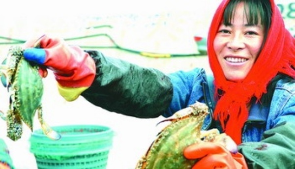 图一:连云港梭子蟹喜获丰收。图为一位渔家女在渔港码头展示刚捕捞上来的梭子蟹。 新华社发 王 春摄