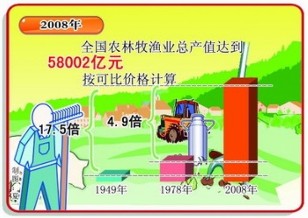 60年来,我国农业综合生产能力大幅度提高,农业经济实力不断增强,突出特征是国家粮食安全得到了有力的保障,副食品生产和供应丰富多样,农业经济呈现出勃勃生机。2008年,全国农林牧渔业总产值达到58002亿元,按可比价格计算,比1949年增长17.5倍,比1978年增长4.9倍,1949年至2008年、1978年至2008年年均增长速度分别达到5%和6.4%,大大超过了同期世界农业的平均增长速度。