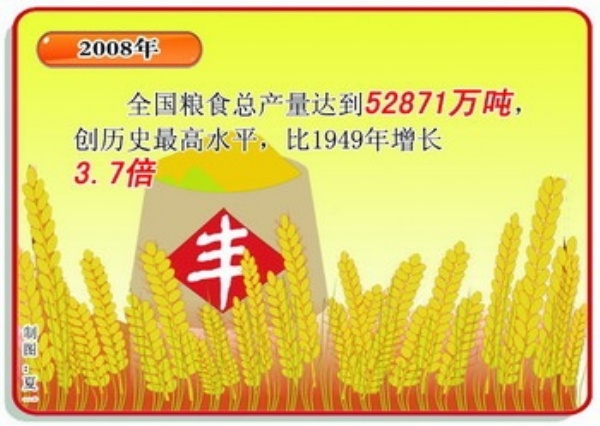2008年,全国粮食总产量达到52871万吨,创历史最高水平,比1949年增长3.7倍,比1978年增长70%,我国粮食的综合生产能力已经达到5亿吨以上,国家粮食安全水平大大提高。经济作物和其他多种经营快速发展,2008年,全国棉花产量达到749万吨,比1949年增长16倍;油料产量达到2953万吨,比1949年增长10.5倍;水果产量达到11339万吨,比1949年增长93.5倍。