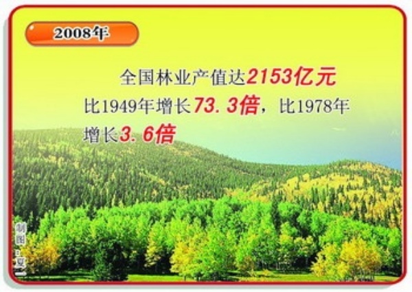 2008年,全国林业产值达2153亿元,比1949年增长73.3倍,年均增长7.6%,比1978年增长3.6倍,年均增长5.2%。60年来,我国在造林绿化方面,坚持以消灭宜林荒山荒地和实现全面绿化为中心,大力调整林种、树种结构,严把造林质量关,取得了显著成效。2008年,全国造林面积535.5万公顷,比1950年增长近30倍。特别是从1978年开始,为加快改善生态环境步伐,国家相继实施了“三北”、“长防”、“沿海”、“防沙治沙”等十大林业重点工程,经过几十年的努力,我国生态环境得到进一步改善。2008年,全国森林覆盖率达到18.2%,比新中国成立初期有了较大幅度的提高;造林质量和效益稳步提高,人工造林核实保存率保持在90%以上。2008年,全国人工林面积达到368.5万公顷,已占到世界人工林面积的近三分之一,竹木采伐实现由以采伐天然林为主向以采伐人工林为主的转变。