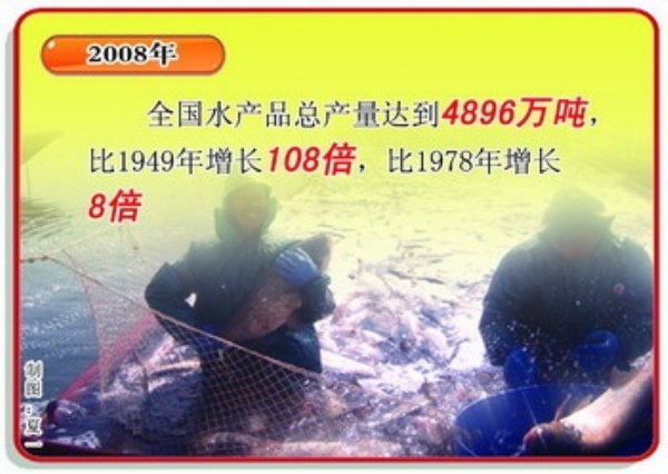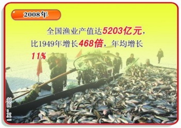 2008年,全国渔业产值达5203亿元,比1949年增长468倍,年均增长11%。60年来,我国渔业生产规模不断扩大,生产能力不断提高。2008年,全国水产品总产量达到4896万吨,比1949年增长108倍,比1978年增长8倍,水产品总产量自1989年起连续19年居世界首位。特别是改革开放以来,我国渔业保持强劲的发展势头,城乡居民“吃鱼难”的问题得到解决,实现了从“连年有鱼”到“天天有鱼”的历史性转变。如今市场上的水产品不仅数量充足,而且品种繁多,质量提高,价格稳定,成为我国城乡居民“菜篮子”不可缺少的重要品种。