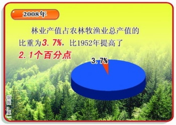 2008年,林业产值占农林牧渔业总产值的比重为3.7%,比1952年提高了2.1个百分点。林业内部,林产品产值比重逐步提高,占林业产值比重由1983年的23.4%提高到2008年的35%;由于实行退耕还林,2003年林木培育和种植的产值比重为33.3%,为历年来最高;2008年竹木采伐产值的比重为35.1%,比实行天然林保护工程前大幅度下降。