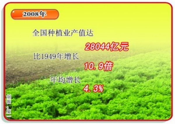 2008年,全国种植业产值达28044亿元,比1949年增长10.9倍,年均增长4.3%。在种植业中,粮食生产一直受到党和国家的高度重视,从农业生产条件的改善到农业科技的推广都投入了大量资金,从而保证粮食生产的稳步增长,使我国的粮食安全得到了有力的保障。在保证粮食生产的前提下,国家积极引导农民进行种植业结构调整,使我国种植业生产迎来历史上最好的发展时期。