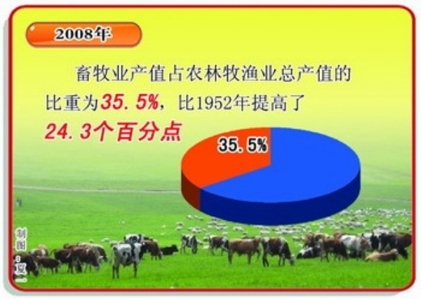 2008年,我国畜牧业产值达20584亿元,比1949年增长40.2倍,年均增长6.5%。改革开放以来,国家相继放开了畜产品价格,畜牧业成为最早进入市场调节的产业,畜牧业由此进入了快速发展阶段,从1978年到2008年,畜牧业产值增长了10.6倍,年均增长8.5%。