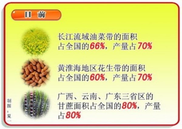经过60年的发展,我国已经形成了几条颇具特色的农业产业带,例如以东北及内蒙古东部为主的玉米产业带的形成,彻底改变了我国南粮北运的历史,成为我国畜牧业发展的饲料粮基地。河北、山东、河南成为我国冬小麦主产区,2008年的产量占到全国总产量的56%以上;新疆成为我国最重要的棉花产区,2008年的棉花产量占全国40%。目前,长江流域油菜带的面积占全国的66%,产量占70%;黄淮海地区花生带的面积占全国的60%,产量占70%;广西、云南、广东三省区的甘蔗面积和产量均占全国的80%左右。