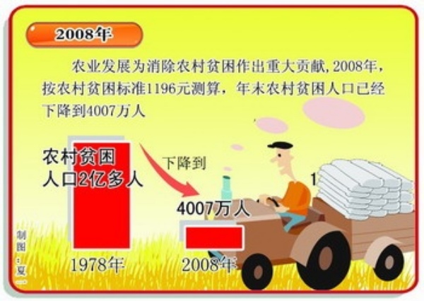 新中国成立后的相当长一段时间里,农民的温饱问题都没有得到彻底解决,到1978年,全国仍然有2亿多农村贫困人口。党的十一届三中全会后,随着各项农业和农村改革措施的出台,农业生产力水平和粮食产量大幅度提高,基本解决了困扰多年的温饱问题,使绝大部分贫困人口摆脱了贫困。2008年,按农村贫困标准1196元测算,年末农村贫困人口已经下降到4007万人。
