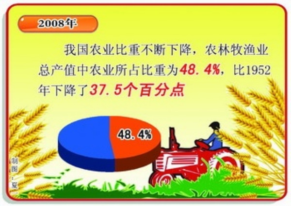 由于工业的快速发展,农业在国内生产总值中的比重不断下降,1952年农业增加值占国内生产总值的比重为50.5%,1978年为28.1%,2008年为11.3%,而工业所占的比重已经上升到2008年的42.9%,表明我国已从工业化初期阶段进入中期阶段,城镇化进入快速发展时期,农业已经完成了自己的历史使命,进入到需要工业反哺农业,为现代农业发展服务的新阶段。
