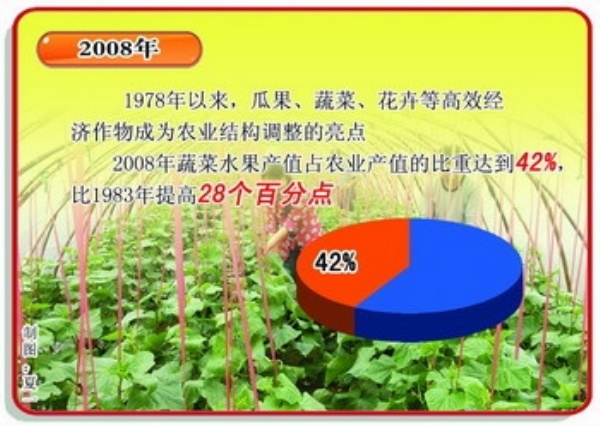 2008年,农林牧渔业总产值中农业所占比重为48.4% ,比1952年下降了37.5个百分点。农业内部在保证粮食生产的前提下,适当调减了粮食面积,增加了经济作物面积。特别是1978年以来,积极发展瓜果、蔬菜、花卉等高效经济作物成为农业结构调整的亮点。2008年蔬菜水果产值占农业产值的比重达到42%,比改革初期的1983年提高28个百分点。