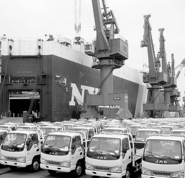 图三:连云港港口一辆辆轻型载货货车从码头装船出口国外。