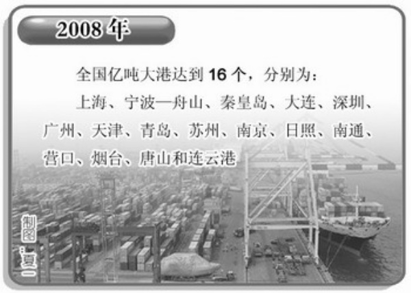 以数量为证:吞吐量是港口最重要的数据指标,直接体现着港口的综合实力。2008年,中国港口完成货物吞吐量、外贸货物吞吐量分别为70.22亿吨和19.86亿吨,其中,外贸货物吞吐量占世界港口的大约八分之一。