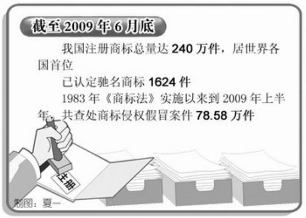 2009年9月15日,国家工商总局宣布,截至目前,我国商标年审查量已突破百万大关,达100.5万件。目前,我国商标注册申请量、审查量和有效注册量均居世界第一,成为名副其实的商标大国。