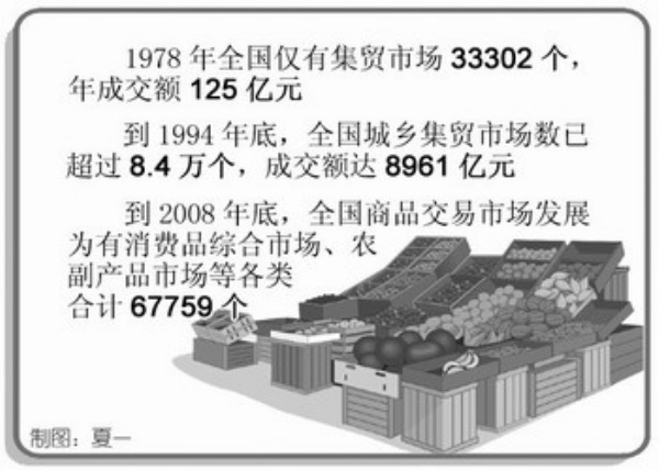 1979年初,浙江义乌廿三里、稠城两地的农民自发的在稠城镇县前街歇担设摊。同年3月,工商管理总局作出决定:放宽农村集市贸易管理,恢复城市农副产品市场。如今,义乌中国小商品城面积达400余万平方米,从业人员20余万,日客流量20多万人次,来自世界各地10万余家生产企业6000余个知名品牌在这里常年展示170万种商品,商品辐射到215个国家和地区。2008年,市场总成交额381.81亿元。