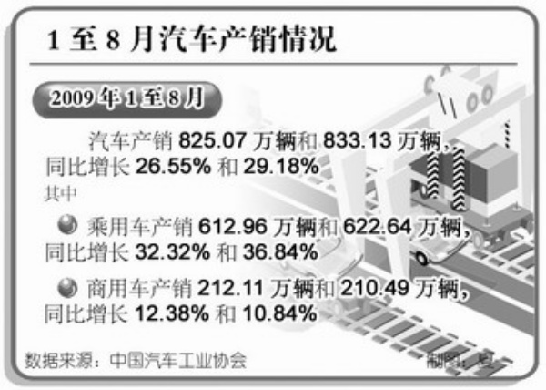究其原因,这和我国宏观经济情况的好转,国家出台相关促进政策的拉动及消费者信心的提升密切相关。在乘用车市场,MPV(多功能乘用车)8月的表现颇为抢眼,产销分别为1.97万辆和2.02万辆,环比分别增长20.52%和14.79%。MPV通常被用作公务或商务车,国际金融危机的爆发,让不少企业将预算压缩,MPV的产销因此而受到影响。然而,随着经济环境的好转和消费信心的回升,MPV市场开始出现积极变化。商用车市场的发展被认为与经济环境改变的关系更为密切。经济形势的向好,国家扩大内需政策效应的逐步显现,让8月的商用车产销分别完成28.32万辆和28.02万辆,比上月分别增长8.75%和10.30%。与上月相比,除客车非完整车辆有所下降外,其余车型均呈不同程度增长。