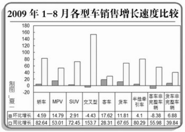 其中,8月乘用车产销分别完成85.75万辆和85.83万辆,比上月分别增长0.75%和3%,比上年同期分别增长97.23%和90.18%;商用车产销分别完成28.32万辆和28.02万辆,比上月分别增长8.75%和10.30%,比上年同期分别增长58.96%和59.82%。从这两大类车型的完成情况看,8月汽车产销在结构上继续呈现全面增长,乘用车无论在总量上还是增长速度上均呈现良好的发展态势,商用车产销在经历了低迷的阶段后出现了稳步提升的趋势。