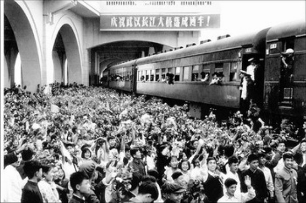 | 左图 1957年,在数十万群众的欢呼声中,武汉长江大桥顺利通车,仅用几分钟便跨越长江天堑,中国人“一桥飞架南北,天堑变通途”的梦想终成现实。 |