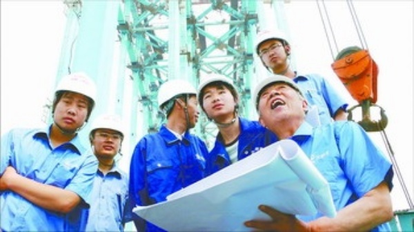 | 曾经参加过武汉长江大桥、南京长江大桥建设的中铁大桥局桥梁专家万方(右一),如今又奋战在南京大胜关长江大桥的工地上,带出了一批又一批的优秀人才。