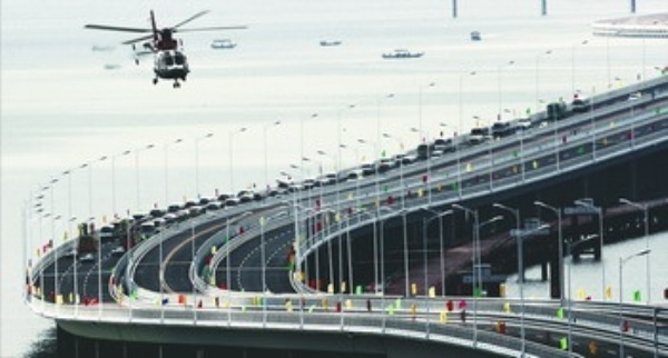 | 下图 厦门集美大桥2008年建成通车,全长10.057公里的大桥,从开建到完工仅一年半,创造了国内外建桥速度的奇迹,充分展现了我国建造大型、超大型桥梁在国际建桥领域技术上、设备上、施工能力上的领先实力。 |