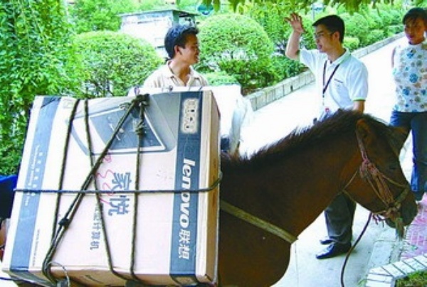 下图:农民用毛驴把新电脑搬回家(2004年摄)。