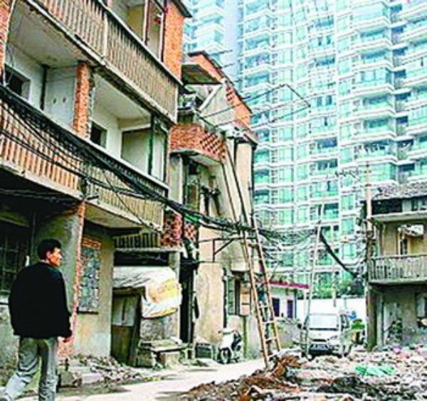 下图:2009年3月19日,上海市长宁路旁的老式居民区拆迁工地。新华社记者 陈 飞摄