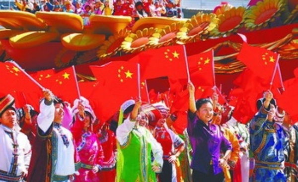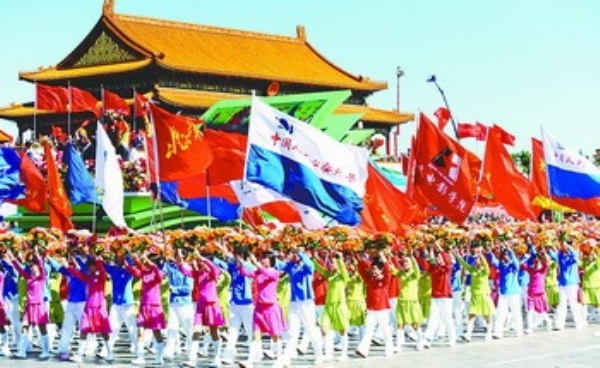 10月1日,首都各界庆祝中华人民共和国成立60周年大会在北京天安门广场隆重举行。以“我与祖国共奋进”为主旨的群众游行分“奋斗创业”、“改革开放”、“世纪跨越”、“科学发展”、“辉煌成就”、“锦绣中华”、“美好未来”7个部分,由36个方阵、60辆彩车和6节行进式文艺表演组成,4000多人的军乐团、民乐团、合唱团现场演奏演唱。参加游行的10万各界群众以不同方式,尽情抒发对中国共产党和人民共和国的由衷赞美和美好祝福。