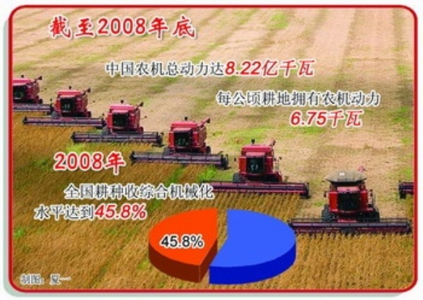 60年来,我国农业逐步告别了犁耕马拉的历史,农业生产现代化程度不断提高。据农业部农业机械化管理司司长宗锦耀介绍,截至2008年底,中国农机总动力达8.22亿千瓦;每公顷耕地拥有农机动力6.75千瓦;拖拉机保有量2022万台。农业机械化水平进入了中级发展阶段,2008年底,全国耕种收综合机械化水平达到45.8%。