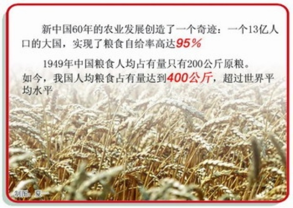 新中国60年的农业发展创造了一个奇迹:一个13亿人口的大国,实现了粮食自给率高达95%,以占世界7%的耕地养活了占世界22%的人口。