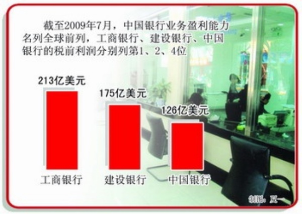 2009年7月,英国《银行家》最新排名公布,中国银行业务盈利能力名列全球前列,工商银行、建设银行、中国银行以213亿美元、175亿美元、126亿美元的税前利润分别列第1、2、4位。