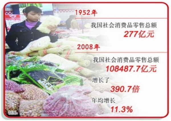 国家统计局公布的数据显示,1952年,我国社会消费品零售总额仅有277亿元,但2008年,这一数字达到108487.7亿元,增长了390.7倍,年均增长11.3%。