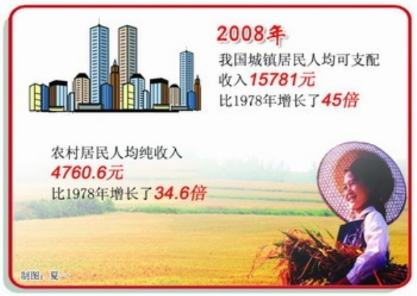 “收入水平提高和消费环境改善是人们消费水平提升的重要原因。”黄国雄表示。数据显示,2008年,我国城镇居民人均可支配收入15781元,比1978年增长了45倍;农村居民人均纯收入4760.6元,比1978年增长了34.6倍。