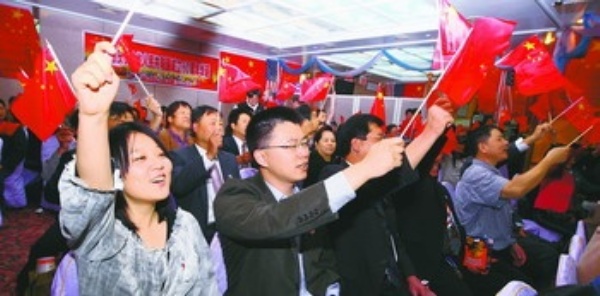 9月30日晚,在美国纽约,华侨华人挥舞国旗通过电视直播观看国庆阅兵式。当日,纽约众多华侨华人欢聚一堂,观看国庆阅兵式电视直播。