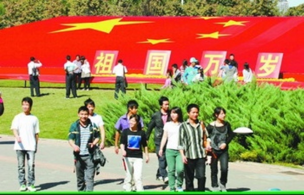 10月4日,北京朝阳公园广场草坪,游客纷纷在巨型国旗前驻足、拍照,脸上洋溢着自豪之情。 本报记者 李树贵摄
