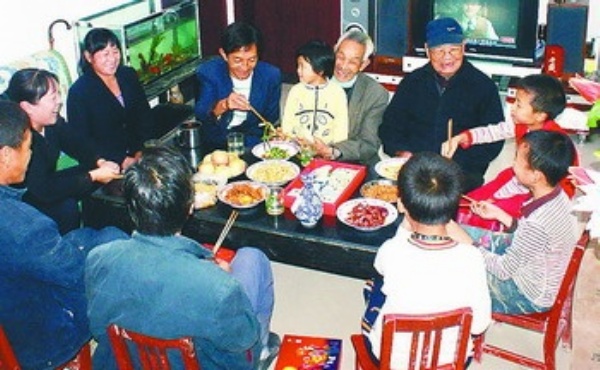 10月3日,陕西省宁强县汉源镇七星池村重建户赵泽红一家人在新居内吃团圆饭。黎德华摄(新华社发)