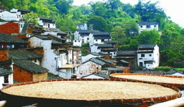 10月4日,婺源县江湾镇篁岭村村民在房前晒稻谷。眼下正值江西省婺源县各地乡村的秋收季节,该县许多农民工返乡和家中亲人一起收割水稻,并把秋收下的稻谷铺在竹匾里架在窗外晾晒,形成一幅美丽的金秋晒谷图。 王国红摄(新华社发)