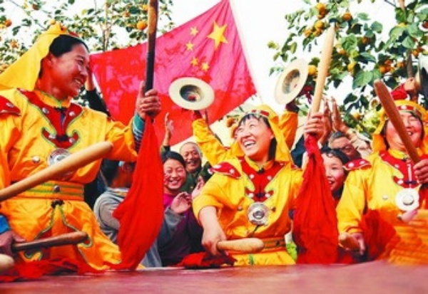 10月5日,位于长城脚下的河北省迁安市大崔庄镇石梯子沟村农民敲起威风锣鼓,表达对祖国的热爱。连日来,迁安市组织群众开展丰富多彩的文化活动欢度国庆。 本报记者 李景录摄