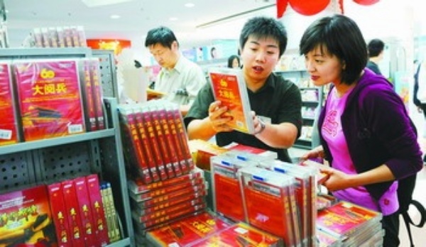 10月6日,顾客在北京西单图书大厦选购刚刚上架的《中华人民共和国成立60周年大阅兵》光盘。