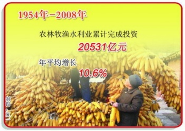 农田水利建设不断加强,农业基础地位得到巩固。1954年至2008年,农林牧渔水利业累计完成投资20531亿元,年平均增长10.6%。