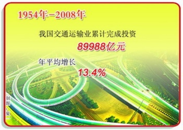 1954年至2008年,我国交通运输业累计完成投资89988亿元,年均增长13.4%,交通运输建设突飞猛进,由铁路、公路、民用航空、水运和管道组成的综合交通运输网络四通八达。