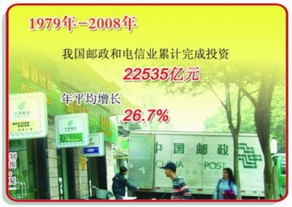 1979年至2008年,我国邮政和电信业累计完成投资22535亿元,年均增长26.7%,建成了覆盖全国、通达世界、技术先进、业务全面的国家信息通信基础网络。网络规模和用户数均居全球第一,发展速度也位居世界前茅。邮政业务种类齐全、网点分布广泛。固定电话用户由1949年的22万户猛增到2008年的34036万户,增长1561倍;移动电话从无到有,2008年末已达6.4亿户。从1949年到2008年,全国邮电业务总量从1.5亿元增加到23650亿元,增长15765倍;邮路及农村投递线路总长度由70.6万公里增加到735万公里,增长9.4倍。