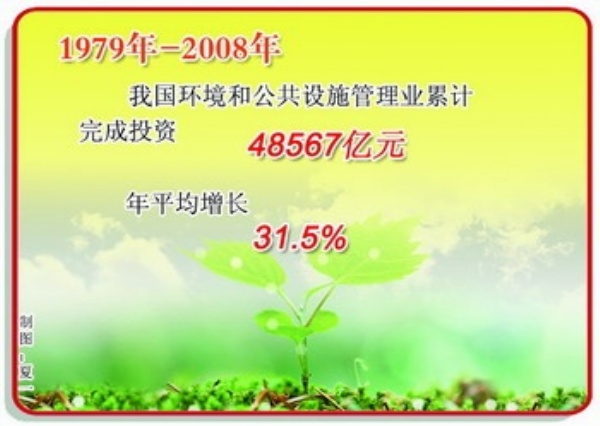 1979年至2008年,我国环境和公共设施管理业累计完成投资48567亿元,年均增长31.5%,是基础产业和基础设施中年均增速最快的行业。环境管理和保护、城市公共交通、绿化、污水处理、供水供气等设施条件明显改善。