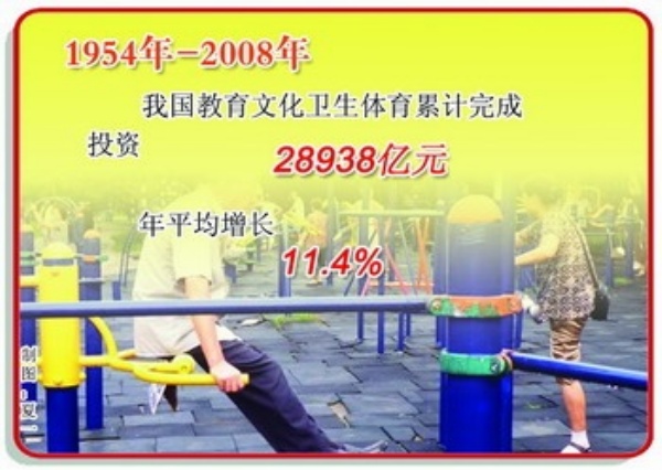 新中国成立以来,国家对教育、文化、卫生、体育基础设施的投入不断加强,1954年至2008年,我国教育文化卫生体育累计完成投资28938亿元,年均增长11.4%,行业基础设施水平显著增强。