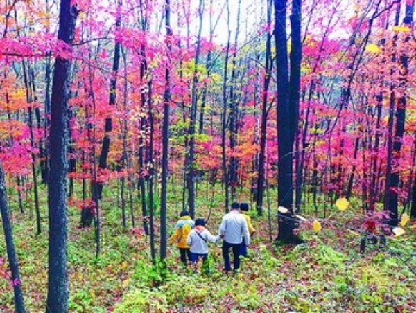 中图:这是吉林省红石林业局林场的漫山红叶景观。国庆黄金周期间,不少游客到吉林森林游,亲近大自然。