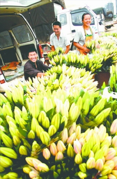图1:昆明市联盟路花卉市场,张士发三兄妹的鲜花摊位生意红红火火。几年来,昆明市经济实现了健康快速发展,2008年生产总值达到1605.93亿元。新机场开工了,地铁建设了,城市变绿了,滇池变清了,交通顺畅了……全市600多万群众分享着改革开放和新昆明建设成果。