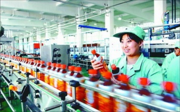 图3:昆明娃哈哈启力饮料有限公司员工马雪静认真检查产品外观。该公司由杭州娃哈哈集团和盛佳集团有限公司共同投资兴建,4条生产线全部建成投产,实现销售收入2.72亿元。