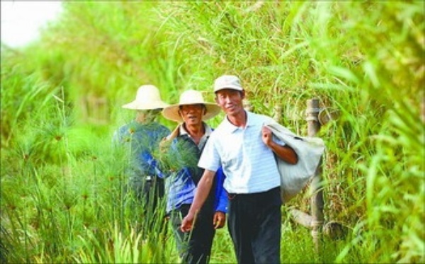 图6:官渡区五甲塘村湿地,当地农民周洪才(前)说:“湿地的芦苇长这么高,小时候才有的景象开始恢复了。”占地1392亩的五甲塘湿地公园是滇池保护治理的重要项目,有效调节了当地径流,净化了水质和空气。